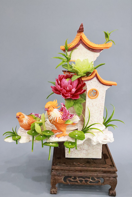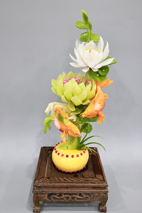 此次受央視邀請,該校烹飪專業團隊在裘海威老師的組織與指導下,圍繞七夕主題,以西瓜、各類蔬果為主要食材,充分施展精湛的烹飪雕刻技藝。創作過程中,裘海威老師憑借豐富經驗,精準把握食材特性,悉心引導學生;學生們運刀如筆,將西瓜雕琢成一朵朵造型立體、紋理細膩的“藝術花卉”和其他別致圖案,創意十足。而鴛鴦、鯉魚繞蓮等作品,更是師生們把食材形態與藝術構思巧妙融合的成果,鴛鴦栩栩如生,仿佛隨時能振翅欲飛;鯉魚靈動活潑,環繞著蓮花,盡顯生機與靈動,每一處細節都彰顯著烹飪雕刻技藝的深厚功底。