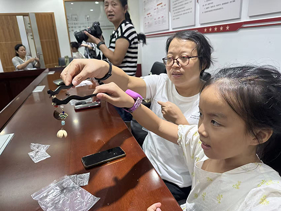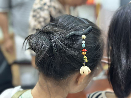 科普環節結束后,手作體驗正式開啟。工作人員提前備好干燥的白芷花、甘草枝、銀質發簪基底、膠水、裝飾繩等材料。“大家可以先挑選喜歡的草藥,把它固定在發簪上,再用繩子繞出花紋……”在手工老師的指導下,居民們紛紛動手創作:有的將白芷花搭配甘草枝,打造清新自然的風格;有的用彩色繩結點綴,讓發簪更顯精致。“以前只知道甘草能泡水,沒想到做成發簪這么好看,還能帶著‘草藥香’,太有意義了!”剛完成作品的居民李阿姨舉著發簪笑著說,還不忘向身邊人分享自己的制作技巧。