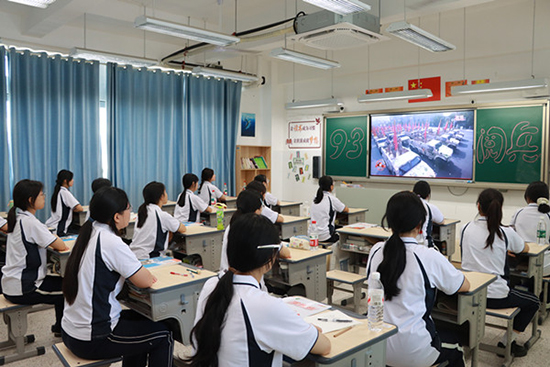當(dāng)天9時(shí)許,學(xué)校師生們?cè)缭绲卮蜷_直播鏈接,懷著激動(dòng)的心情等待閱兵活動(dòng)的開始。畫面映入眼簾,閱兵儀式上,整齊劃一的方隊(duì)、先進(jìn)精良的武器裝備依次通過天安門廣場(chǎng),那鏗鏘有力的步伐、排山倒海的氣勢(shì),讓師生們看得熱血沸騰。許多同學(xué)都情不自禁地站起身來,瞪大了眼睛,生怕錯(cuò)過任何一個(gè)精彩的瞬間。當(dāng)看到那些首次亮相的先進(jìn)武器裝備時(shí),教室里更是響起了陣陣驚嘆聲和熱烈掌聲。