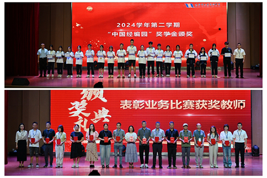 浙江海寧經編產業園區開發公司總經理助理劉彥榮先生宣布中國經編園獎學金名單,并與黨委委員、副校長何家輝老師一同為獲獎學生頒獎。