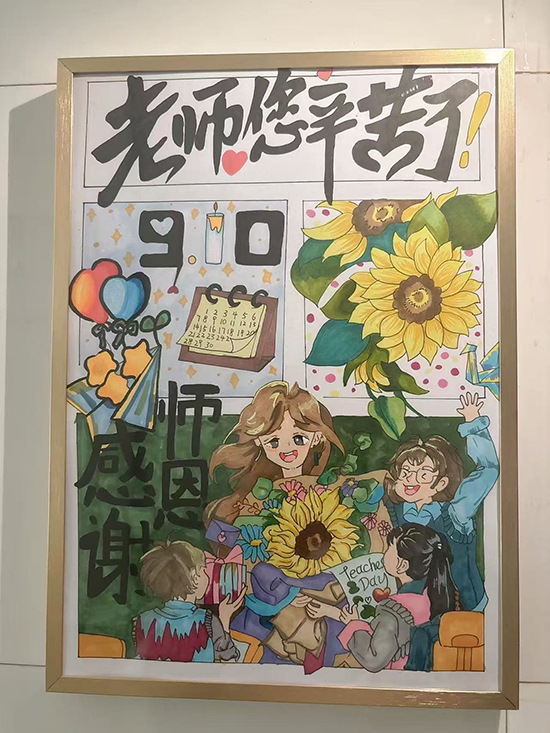 師生餐廳樓梯墻面裝飾了由同學們親手繪制的祝福卡片。一張張卡片色彩鮮明、筆觸真摯,無聲傳遞著莘莘學子對老師的深厚情誼。活動期間,許多教師駐足細看,在圖文之間感受來自學生的真誠祝福。