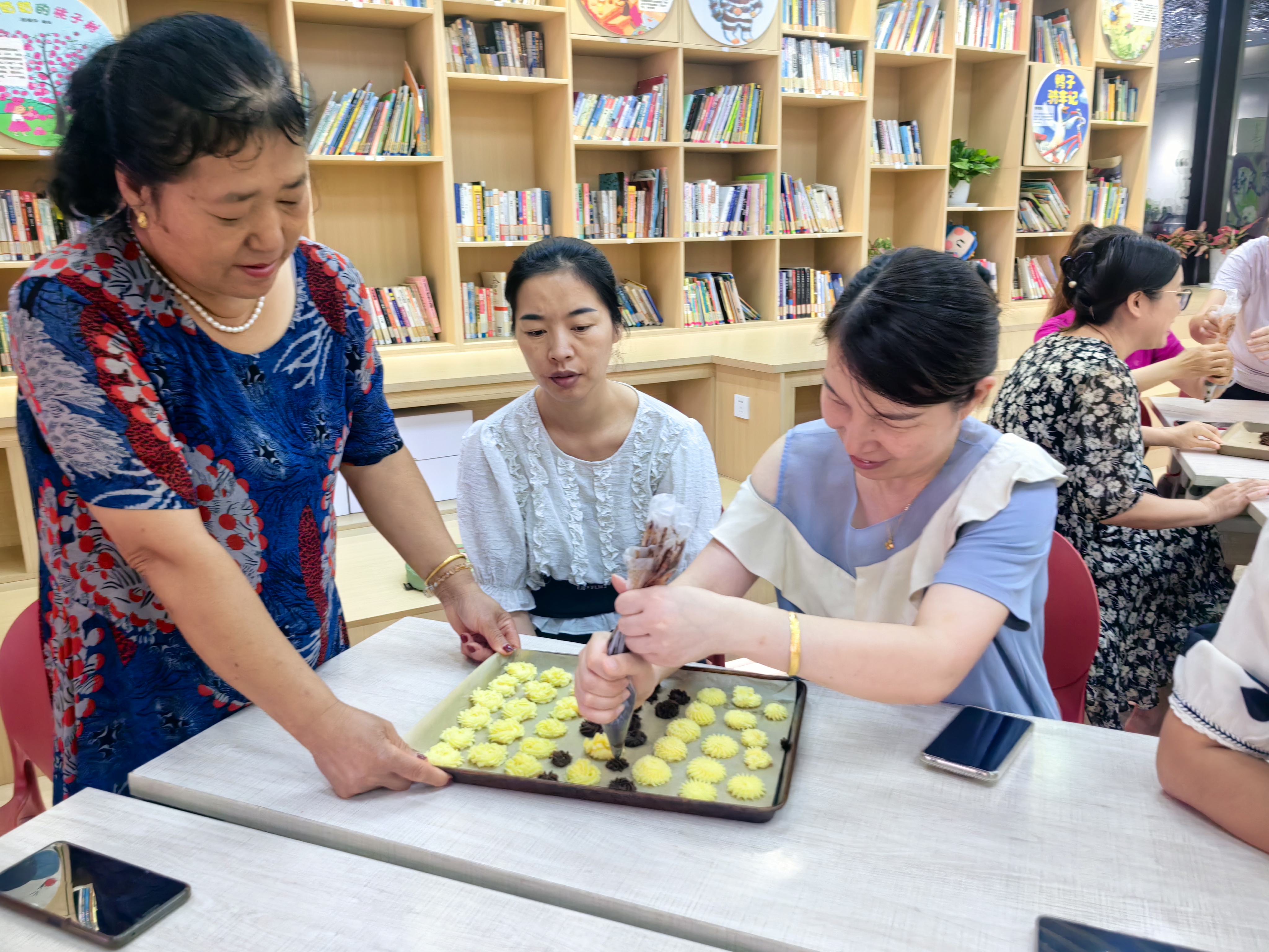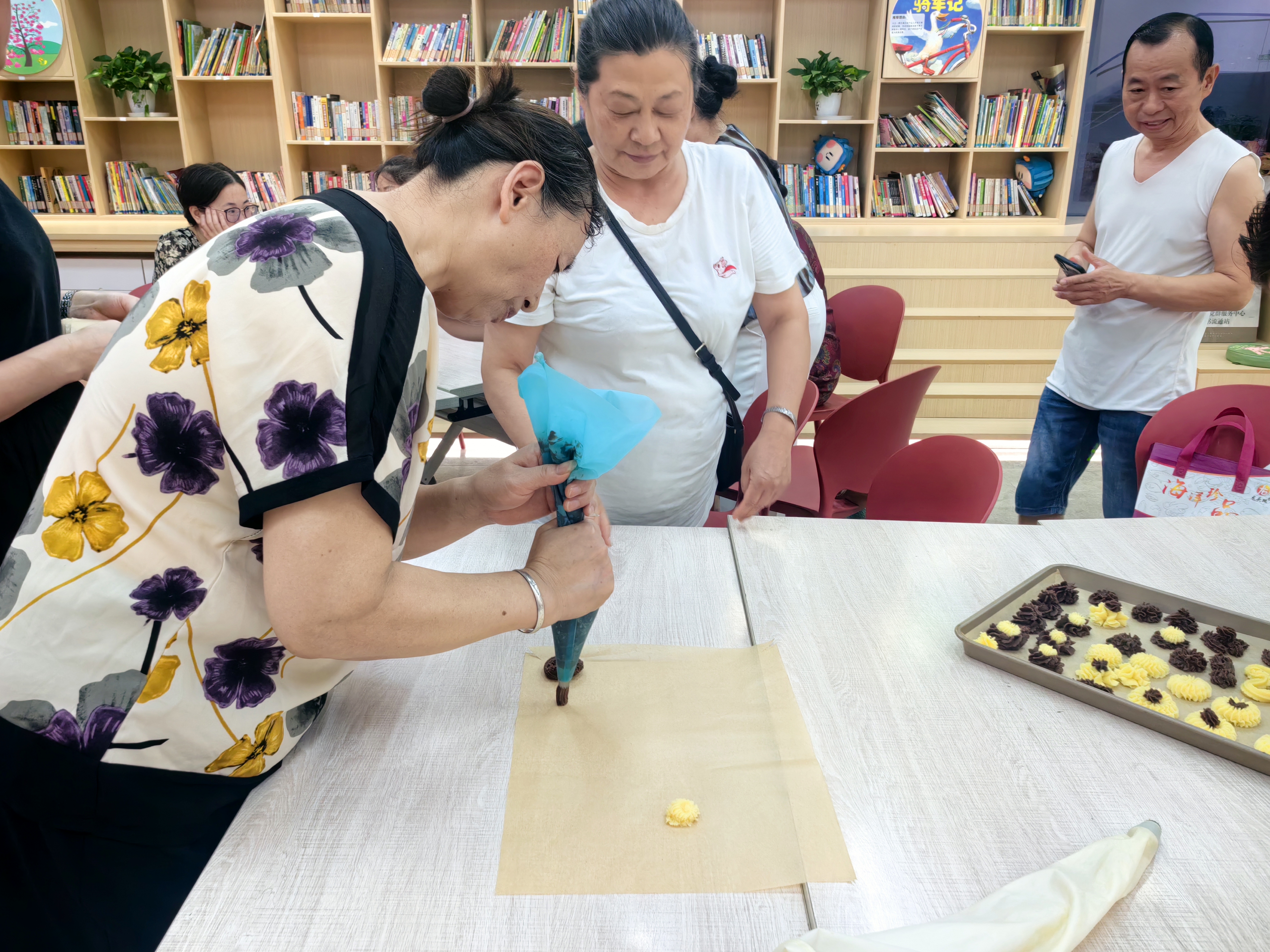課堂上,老師介紹了制作曲奇餅干過程中所需食材、設(shè)備和工具,現(xiàn)場演示制作過程。大家認真地學習,個個躍躍欲試,在老師的指導下,居民朋友們興致勃勃地開始動手制作屬于自己的獨特曲奇餅干。將黃油和白糖攪拌均勻,倒入低筋面粉、糖粉、奶粉,攪拌均勻,把面糊裝入安有裱花嘴的裱花袋中,在烤盤中擠出曲奇花紋。經(jīng)過一道道工序和居民們一絲不茍的創(chuàng)作,一盤盤金黃酥脆的曲奇餅干新鮮出爐。大家是第一次做曲奇,在嘗到了親手制作的美味可口的曲奇后,大家臉上洋溢著幸福甜蜜的笑容。