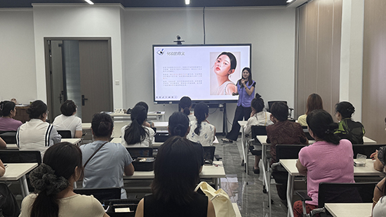 課程伊始,楊老師通過多媒體課件系統(tǒng)性地講解了化妝的步驟,帶領(lǐng)大家一樣樣解開化妝包的“秘密武器”。從各類刷子的功能到每一樣化妝品的功能,每一個細節(jié)都講解得細致入微。在實操演示環(huán)節(jié),老師邀請學(xué)員作為模特,現(xiàn)場演示如何打造輕薄透亮的底妝。“妝前保濕要做好,防曬隔離不可少,粉底要少量多次地上,定妝要輕薄均勻……”老師一邊操作一邊講解,學(xué)員們或認真記錄,或舉起手機拍攝,唯恐錯過任何一個細節(jié)。
