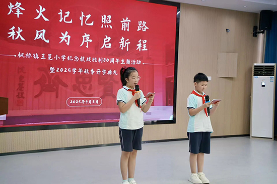 9月3日上午,諸暨市楓橋鎮王冕小學以“烽火記憶照前路 秋風為序啟新程”為主題,同步開展紀念中國人民抗日戰爭暨世界反法西斯戰爭勝利80周年活動與2025年秋季開學典禮,全體師生齊聚主會場——報告廳與34個班教室分會場,在莊嚴與期盼中開啟新學期的篇章。