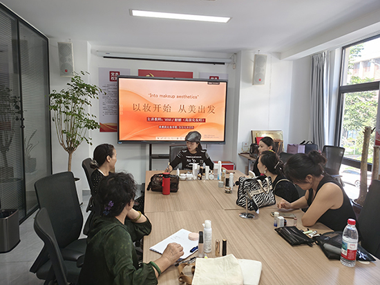 化妝美容課堂上,講師以 “日常通勤妝” 為主題,從底妝服帖技巧到眉形設(shè)計(jì),為 學(xué)員細(xì)致授課,學(xué)員們兩兩一組互相化妝練習(xí),現(xiàn)場(chǎng)不時(shí)傳來(lái)討論聲和笑聲。?