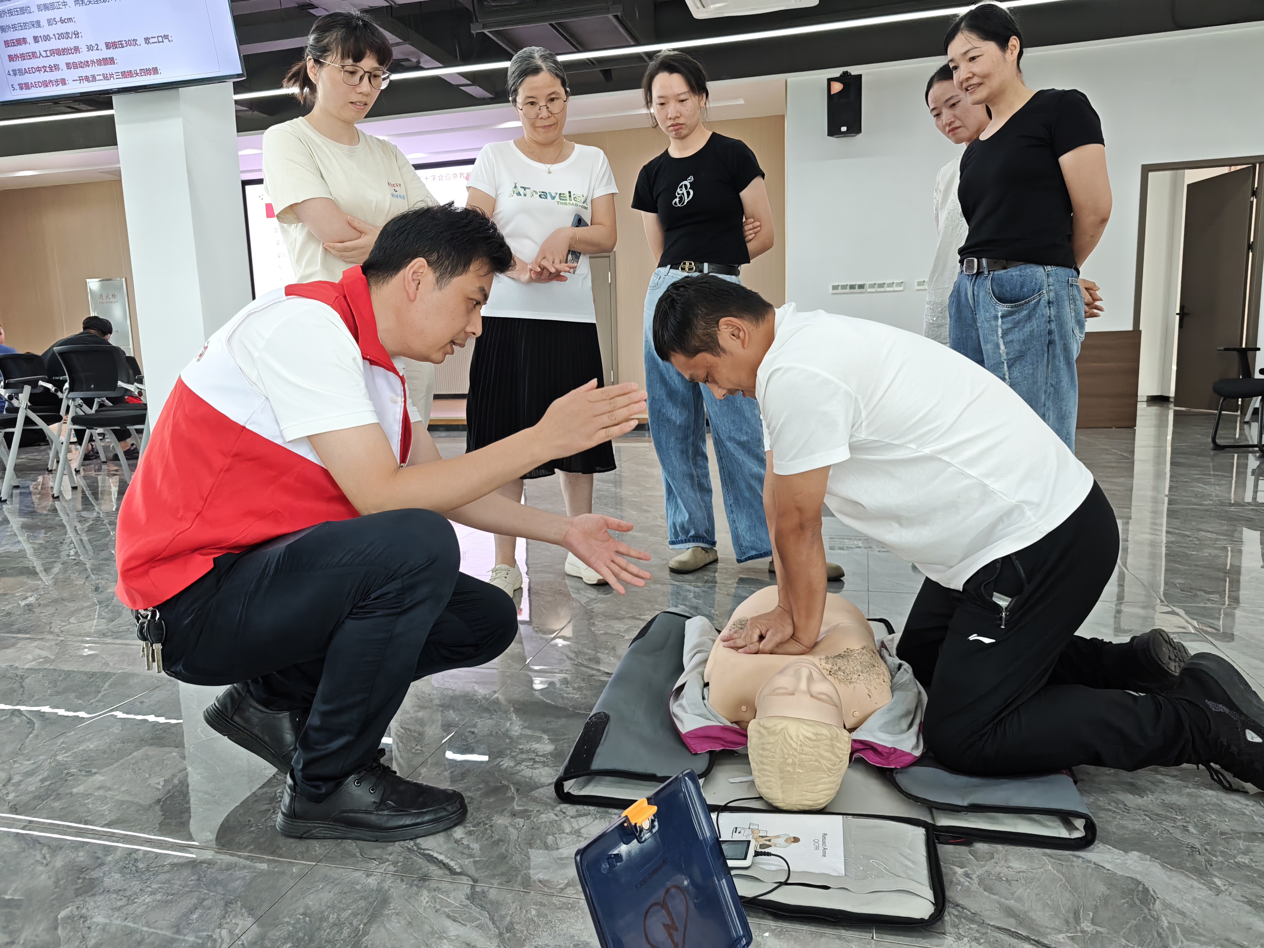 培訓伊始,紅十字會講師以真實案例切入,用通俗易懂的語言講解心臟驟停的危害:“心臟驟停發生后,黃金搶救時間僅有4-6分鐘,抓住這段時間,就能為生命爭取更多可能。”隨后,講師結合圖文課件,詳細拆解AED(自動體外除顫儀)的工作原理,從儀器的構造到電流除顫的科學依據,逐一解答參與者的疑問,讓大家對“救命神器”AED有了系統認知。不少居民一邊聽一邊記筆記,物業工作人員更是拿出手機拍攝重點內容,生怕錯過關鍵信息。理論講解結束后,培訓進入實操環節,這也是大家最為期待的部分。講師將人體模型放置在場地中央,先完整演示一遍心肺復蘇(CPR)的標準流程:從判斷意識、呼喊求助,到打開氣道、胸外按壓,再到人工呼吸,每個動作都精準規范。“按壓位置要在兩乳頭連線中點,按壓時手臂不能彎曲,呼吸時要確保捏住鼻子、完全包住口唇……”講師一邊演示,一邊拆解動作要點,還邀請參與者上臺嘗試,手把手糾正不規范的操作。居民王阿姨首次嘗試時按壓位置偏下,講師立即上前調整:“您看,這樣稍微往上移一點,才能精準作用于心臟,達到急救效果。”在反復練習中,王阿姨的動作逐漸標準,臉上也露出了自信的笑容。