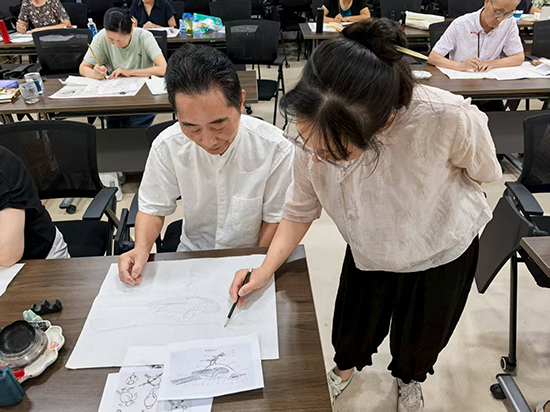 課桌上,硯臺(tái)里磨得細(xì)膩的墨汁泛著光澤,宣紙鋪展如素箋,學(xué)員們握筆的手雖有些許皺紋,卻透著專注與認(rèn)真。老師手把手指導(dǎo)握筆姿勢(shì),從“中鋒行筆”到“淡墨暈染”,耐心拆解每一個(gè)技法要領(lǐng)。張阿姨初學(xué)勾勒梅花,筆尖輕點(diǎn)間,幾瓣嫩蕊漸漸成形;李叔叔專注皴擦山石,墨色濃淡間暈出遠(yuǎn)山意境,不時(shí)和鄰座學(xué)員交流“這筆怎么轉(zhuǎn)更自然”。