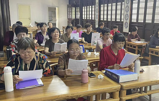 隨著課程推進,“經典紅色歌曲演唱實踐” 環節成為居民們最期待的部分。吳丹老師精選《沒有共產黨就沒有新中國》《我和我的祖國》等多首廣為流傳的經典紅歌,采取 “逐句教唱 + 分組練習 + 集體合唱” 的模式,讓居民們在反復演練中熟悉旋律、掌握技巧。每當集體合唱的旋律響起,激昂的歌聲回蕩在活動中心,不少居民不自覺地挺直腰板,眼神堅定,仿佛在通過歌聲與革命先輩隔空對話。?