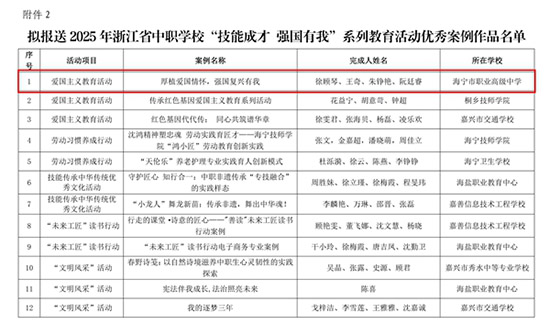 近日,嘉興市中職學校2025年“技能成才 強國有我”系列教育活動獲獎及優秀案例推薦名單公示,海寧市職業高級中學師生憑借扎實的專業功底和出色的創新能力,在活動中表現突出,共榮獲一等獎1項、二等獎1項。其中《愛國主義教育活動 厚植愛國情懷,強國復興有我》案例報送2025年浙江省中職學校“技能成才 強國有我”系列教育活動優秀案例作品。