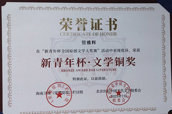 文章完成后,班主任李安興老師鼓勵我大膽嘗試投稿。在他的幫助下,我懷著忐忑又期待的心情,將文章投給了海南衛(wèi)視《榮耀綻放》欄目組,以及由北京出彩中國當代文學組委會主辦的“新青年杯全國原創(chuàng)文學大獎賽”。從初審、大眾投票到終審,每一步我都格外關注,而最終的結果,遠遠超出了我的預期——經過專家評審團的最終評定,我的文章有幸獲得了本次大賽的“文學銅獎”。得知獲獎的那一刻,內心的激動與喜悅幾乎無法用語言形容:這不僅是對我個人努力的肯定,更是對我所熱愛的計算機專業(yè)、對日新月異的AI技術的認可。