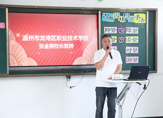 接著,由溫州市龍灣區職業技術學校校長張金熙致辭,他歡迎各位同仁,并深情回顧了學校櫛風沐雨、匠心育人的辦學歷程,強調當前職業教育正處于提質培優的關鍵期,并期待以此次活動為契機,與各兄弟院校攜手共進,為溫州職業教育高質量發展貢獻更大力量。