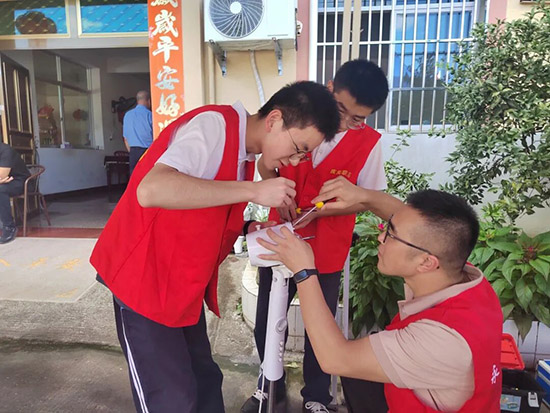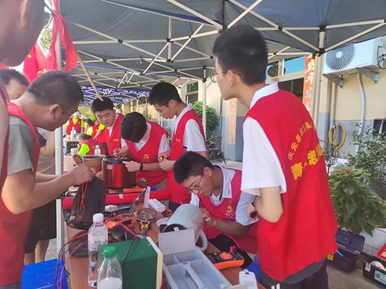 活動(dòng)現(xiàn)場(chǎng),黨員教師們發(fā)揮專業(yè)技能,設(shè)立家電維修服務(wù)點(diǎn),耐心為村民檢修電飯煲、電熱水壺、電風(fēng)扇等常用小家電。針對(duì)像冷柜等不便搬動(dòng)的大型家電,志愿服務(wù)隊(duì)更是貼心地主動(dòng)上門維修,有效解決了村民在日常生活中所面臨的諸多難題。一件件修好的電器,一句句真誠(chéng)的感謝,讓小小的服務(wù)點(diǎn)洋溢著濃濃的溫情。