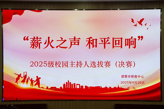 近日,諸暨市職業(yè)教育中心2025級“薪火之聲 和平回響”校園主持人大賽決賽在校多功能廳圓滿舉行。經(jīng)過初賽選拔脫穎而出的10位選手在決賽中同臺競技,最終,25長征1班樓億、25工美班蘭紫怡兩位同學(xué)憑借出色表現(xiàn)榮獲一等獎。