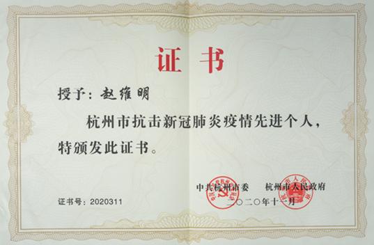 2023年7月,趙維明在公園晨練回來,途中突然聽到刺耳的呼救聲,救命……救命……,只見一位溺水女子在急流的河里掙扎,在這關(guān)鍵時刻,他不顧自己年邁體弱,奮不顧身跳下水中進行搶救,終于把溺水女子救上岸來,被公安部門授予“見義勇為積極分子”稱號。他救死扶傷的感人事跡在《人民日報》《浙江之聲》等都有報道。