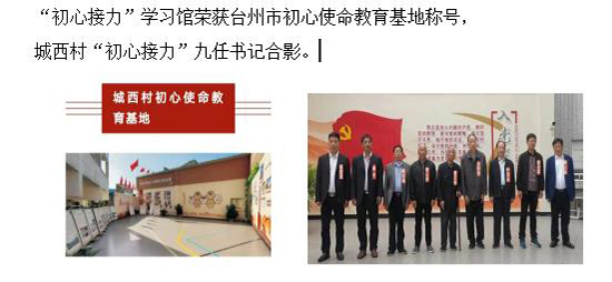 《“初心接力”學習館》被定為浙江省、臺州市、三門縣三級愛國主義教育基地,以及臺州市“跟著紅色地圖學黨史”現場學習教育基地、臺州市初心使命教育基地。隨著深入學習貫徹習近平新時代中國特色社會主義思想走入走新,各級單位組織黨員、群眾前來調研考察、參觀指導。自建館來共接待前來省市縣各級考察團共120批次3500人。開展“初心接力”紅色足跡體驗學習活動。2019.11.8,時任浙江省委副書記、省長袁家軍帶領省級相關部門負責人來三門城西村初心館開展調研活動。2023.12.27,時任省委書記易煉紅等領導來城西村初心館,考察了解農村黨組織開展主題教育和黨建引領鄉村振興等情況。2019年10月10日,時任省委主題教育第十巡回指導組組長余梅生等領導到城西村初心館和黨建廣場體驗學習,并與九任書記合影留念。