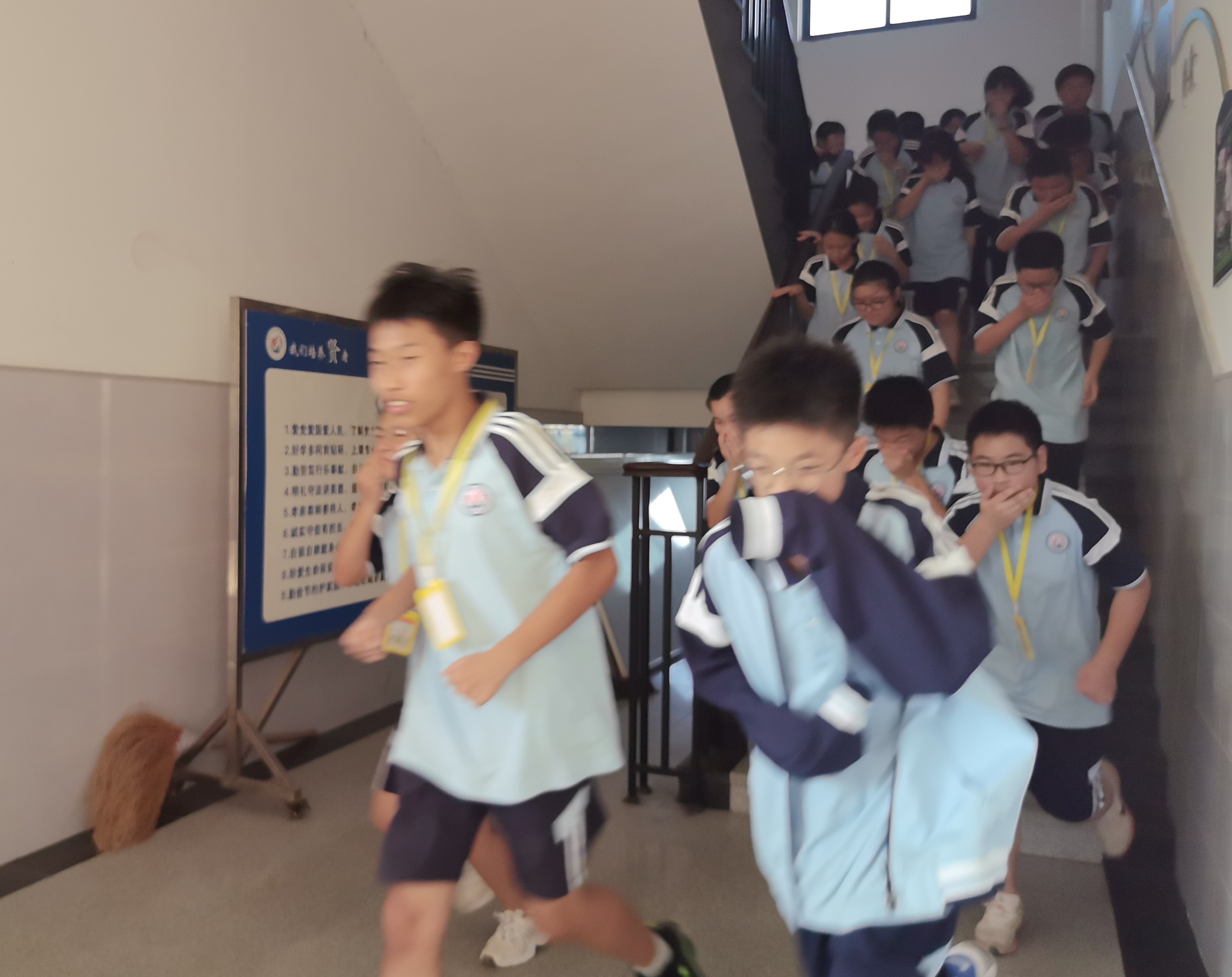 突然,一聲刺耳的警報聲在校園中響起,諸暨市楓橋鎮初級中學七至九年級28個班級的學生在老師的組織下有序用袖口或濕巾捂著口鼻分別從兩側樓梯奔向操場,不一會兒,1200多名學生以班為單位集中在操場上了,原來這是學校正在開展消防逃生演練。