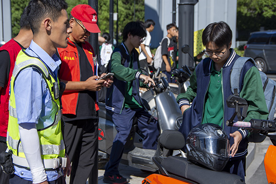 學(xué)校與諸暨市交警部門緊密聯(lián)動(dòng),將安全教育的課堂延伸到校門口,建立常態(tài)化合作機(jī)制。在上學(xué)與放學(xué)的高峰時(shí)段,交警們不僅全力疏導(dǎo)交通,更化身移動(dòng)的“安全宣傳站”。他們特別強(qiáng)調(diào)必須年滿16周歲方可騎行電動(dòng)車,并現(xiàn)場示范如何正確佩戴安全頭盔,提醒同學(xué)們騎行時(shí)不載人、不闖紅燈、不逆行,為平安出行筑起第一道防線。