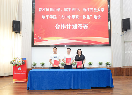 啟動(dòng)儀式上浙江開放大學(xué)臨平學(xué)院、臨平第五中學(xué)、育才映荷小學(xué)主要負(fù)責(zé)人共同簽署《大中小思政一體化建設(shè)合作計(jì)劃》,標(biāo)志著三校跨學(xué)段協(xié)同育人機(jī)制進(jìn)入實(shí)質(zhì)性推進(jìn)階段。