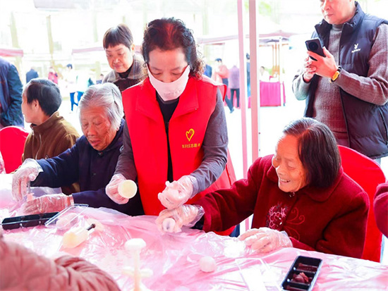 實操環節中,老人們熱情高漲,在楊老師和現場志愿者的貼心協助下,紛紛動手嘗試。大家按照教學步驟,取冰皮、揉圓、壓平,放入喜愛的餡料,小心翼翼地包裹均勻,再放入模具中按壓成型。一個個造型精致、色彩誘人的冰皮月餅逐漸在老人們的手中誕生。過程中,大家相互交流技巧、分享經驗,活動現場充滿了歡聲笑語。