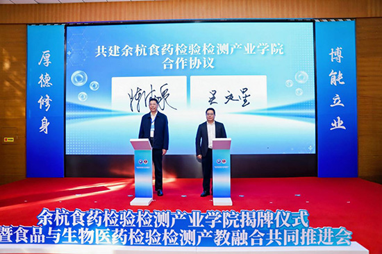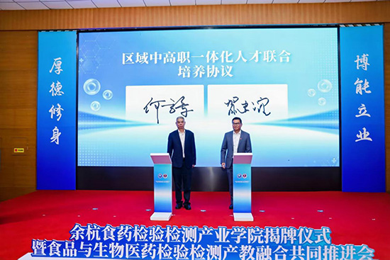 余杭區(qū)教育局黨委書記、局長吳文星與浙江經(jīng)貿(mào)職業(yè)技術(shù)學(xué)院校長陳德泉共同簽署《共建余杭食藥檢驗(yàn)檢測(cè)產(chǎn)業(yè)學(xué)院合作協(xié)議》,標(biāo)志著校地合作從“規(guī)劃”邁向“落地”。