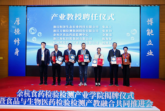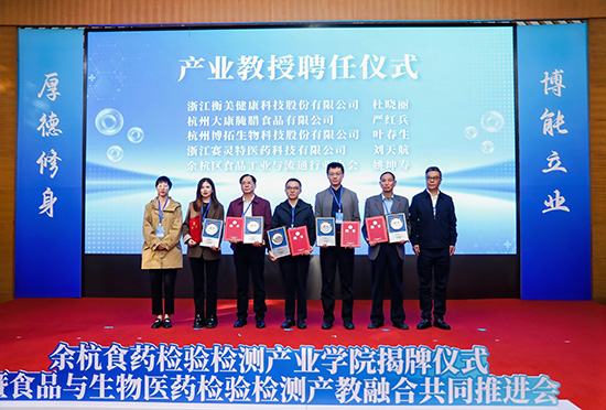為強(qiáng)化“校企協(xié)同教學(xué)”,產(chǎn)業(yè)學(xué)院還聘任了來自浙江恒澤、方圓檢測(cè)、余杭區(qū)食藥監(jiān)測(cè)中心、海虹控股、鴻光浪花、衡美健康、大康食品、博拓生物、賽靈特醫(yī)藥、區(qū)食品工業(yè)與流通行業(yè)協(xié)會(huì)十家單位代表為首批“產(chǎn)業(yè)教授”,由余杭區(qū)政府、市教科院、區(qū)經(jīng)信局、區(qū)市場(chǎng)監(jiān)管局等領(lǐng)導(dǎo)頒發(fā)聘書。