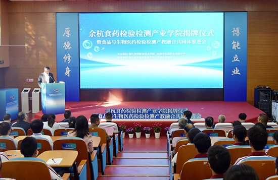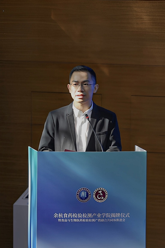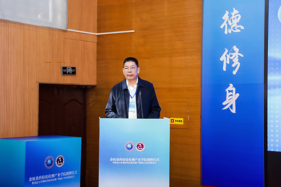 儀式伊始,余杭區(qū)人民政府副區(qū)長羅建強(qiáng)代表區(qū)政府致歡迎辭。他指出,食品藥品安全是重大民生工程,近年來余杭區(qū)圍繞“全球生物醫(yī)藥研發(fā)高地”目標(biāo),依托良渚生命科技小鎮(zhèn)集聚產(chǎn)業(yè)資源,構(gòu)建生命健康產(chǎn)業(yè)生態(tài)圈。此次聯(lián)合浙江經(jīng)貿(mào)職業(yè)技術(shù)學(xué)院、省骨干龍頭企業(yè)浙江恒澤生態(tài)農(nóng)業(yè)科技有限公司,成功申報(bào)全省首批縣域產(chǎn)業(yè)學(xué)院,正是響應(yīng)省教育廳縣域產(chǎn)業(yè)學(xué)院建設(shè)政策的關(guān)鍵舉措,旨在打造“人才培養(yǎng)、技術(shù)研發(fā)、社會(huì)服務(wù)”三位一體的產(chǎn)業(yè)創(chuàng)新平臺(tái)。“學(xué)院將推動(dòng)學(xué)習(xí)場(chǎng)景向檢驗(yàn)實(shí)驗(yàn)室、生產(chǎn)一線延伸,通過‘培養(yǎng)方案共定、實(shí)訓(xùn)基地共建、教學(xué)團(tuán)隊(duì)共組、科研項(xiàng)目共擔(dān)、就業(yè)崗位共促’,為余杭輸送懂理論、精操作、善創(chuàng)新的食藥檢驗(yàn)檢測(cè)人才。”羅建強(qiáng)表示,區(qū)政府將持續(xù)強(qiáng)化政策賦能與資源整合,全力支持學(xué)院發(fā)展。