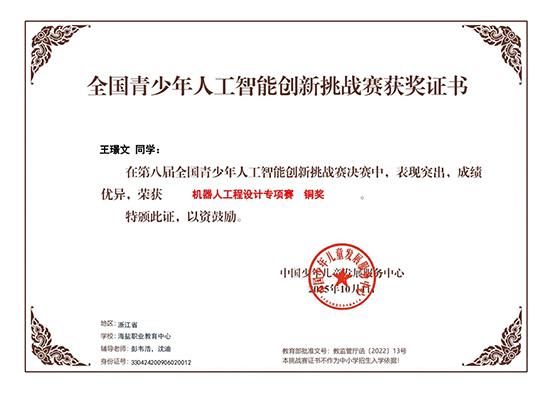 近日,第八屆全國青少年人工智能創新挑戰賽全國總決賽圓滿落幕。海鹽職業教育中心曹敏、王璟文、王小舟學生團隊再度載譽而歸,榮獲一銀、二銅的優異成績!