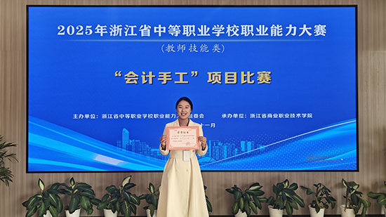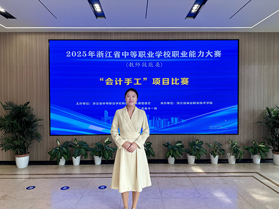 11月2日下午,杭州的決賽賽場傳來振奮人心的捷報 —— 在 2025 年浙江省中職學校職業能力大賽中,永康市職業技術學校的張穎老師憑借扎實的專業功底、創新的教學設計與從容的臨場表現,從全省各地市30余位精英選手的激烈角逐中脫穎而出,一舉奪得“會計手工”項目一等獎,斬獲浙江省第一名的佳績! ?