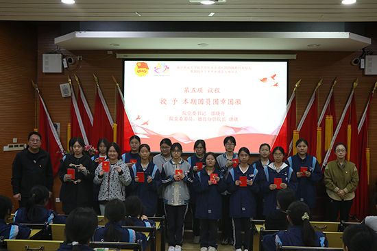 儀式第五項(xiàng)議程:新團(tuán)員入團(tuán)環(huán)節(jié)。院黨委委員、德育分管院長唐瑛宣讀了新團(tuán)員名單,共有 75 名同學(xué)光榮加入中國共產(chǎn)主義青年團(tuán)。隨后,院黨委書記邵曉舟、副院長唐瑛為新團(tuán)員代表授予團(tuán)章、團(tuán)徽。胸前的團(tuán)徽不僅是共青團(tuán)的象征,更是一份沉甸甸的責(zé)任,時(shí)刻提醒著新團(tuán)員們肩負(fù)的使命。