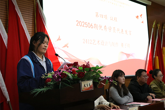 儀式第四項(xiàng)議程,2412 班董子晴同學(xué)作為優(yōu)秀學(xué)員代表發(fā)言,她分享了自己在團(tuán)校學(xué)習(xí)中的心得與感悟,言語間滿是對團(tuán)的熱愛與對未來的期許,也引發(fā)了在場學(xué)員的強(qiáng)烈共鳴。