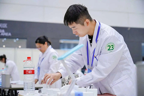 畢業(yè)后,翁致遠始終保持著對技能提升的追求,密切關(guān)注人社部門、成校組織的職業(yè)技能培訓(xùn),主動選擇感興趣的領(lǐng)域深耕。2022年,他報名參加評茶培訓(xùn),不僅順利考取高級評茶員證書,更在學(xué)習(xí)中加深了對茶文化的熱愛。從嘉興市賽的初露鋒芒,到省賽的層層突圍,再到站上全國賽場,他的備賽之路滿是汗水:因肢體殘疾,他在實操動作、感官判斷上需要付出更多努力,賽前60余天的集中訓(xùn)練里,他研習(xí)200余種茶樣、開展300余次模擬賽事,始終繃緊“嚴謹備賽”這根弦,用反復(fù)打磨的技藝彌補差距。