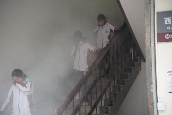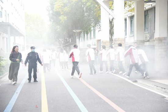 上午9時35分,隨著消防警報響起,演練正式啟動。各教學樓內師生迅速響應,在班主任和疏散引導員的指揮下,用濕毛巾捂住口鼻,彎腰低姿,嚴格按照預定路線有序撤離。整個過程緊張而不慌亂,僅用時3分09秒,全體師生已全部安全疏散至操場指定區域,并完成人員清點與匯報,展現了高效的協同機制和應急處置能力。