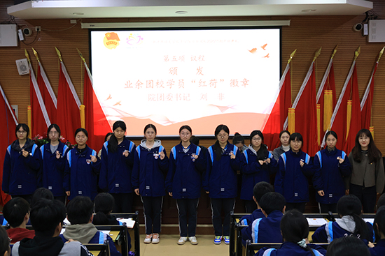 授予紅荷徽章,強化組織認同:為增強學員組織歸屬感與榮譽感,典禮舉行 “紅荷”團?;照率谟鑳x式。院團委書記劉非為學員代表佩戴徽章,徽章象征著光榮與責任,提醒全體學員時刻以團員標準嚴格要求自己,展現團校學員的良好風貌與使命擔當。