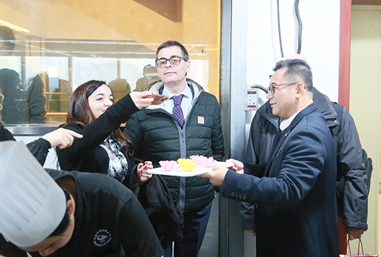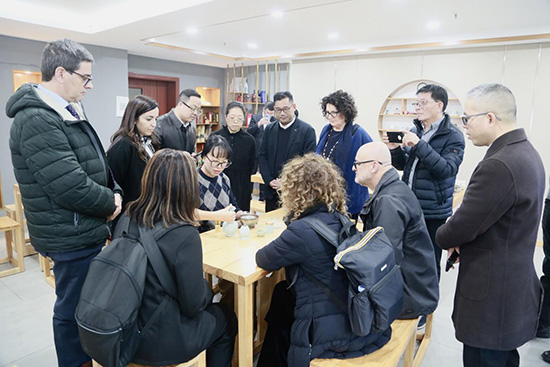意大利來訪的校長們參觀了華僑職專校園,觀看華僑職專學生龍獅隊的表演。還深入“鼎融”實訓樓內的潘曉林大師工作室、米塑非遺館、甌菜研究所等特色教學實訓場所,現場觀摩了烹飪專業學生的中式熱菜實訓與旅游酒店專業學生的餐巾折花展示,深切感受到中國職業教育的實踐魅力與溫州本土文化的獨特韻味。在茶藝實訓室,嘉賓們親身體驗了中國茶藝,在氤氳茶香中領略中華傳統文化的深厚底蘊。