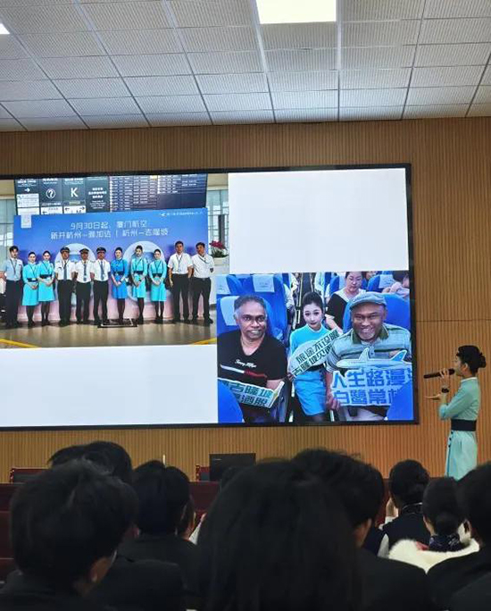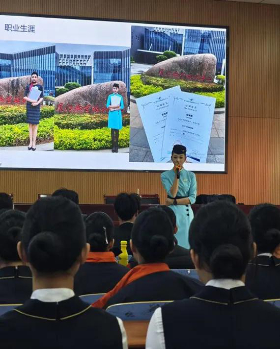 徐雨桐結合自己從校園到職場的成長歷程,用生動鮮活的案例分享了職業(yè)發(fā)展中的關鍵節(jié)點。她從航空服務禮儀規(guī)范、客艙應急處置技巧、職業(yè)心態(tài)培養(yǎng)等核心內容入手,詳細拆解了空乘崗位的能力要求,強調“讓乘客滿意的服務是我們最基本的,而讓乘客感動的服務是我們追求的”。針對同學們關心的面試技巧、崗前培訓重點等問題,學姐毫無保留地分享了自己的實戰(zhàn)經驗,總結出“簡歷突出實踐經歷、面試展現真誠態(tài)度、技能夯實專業(yè)基礎”的求職干貨,讓在場學生受益匪淺。