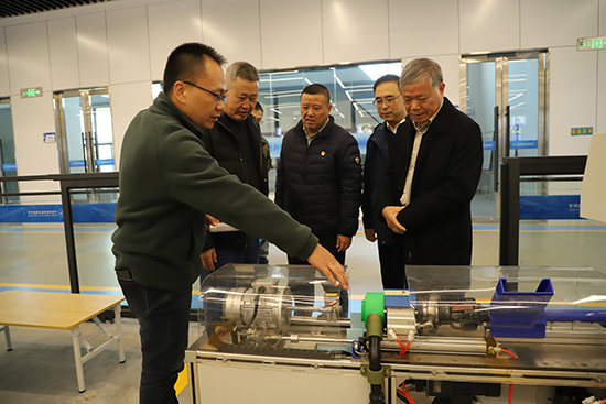 在鄞州職高黨委書記盧科和校長張武劍的帶領下,陳安平副主席一行實地參觀了校園,深入了解教學環境與設施建設。面對嶄新的教學環境和先進的教學設備,他們深切感受到時代發展與教育質量的顯著提升。在實訓場地,現代化的金屬3D打印技術以及由學校教師自主研發、并獲得實用新型專利的“智能薄壁沖孔鋁管內壁去毛刺機”等成果,更是令他們頻頻駐足,贊嘆不已。