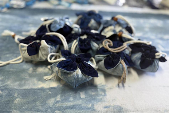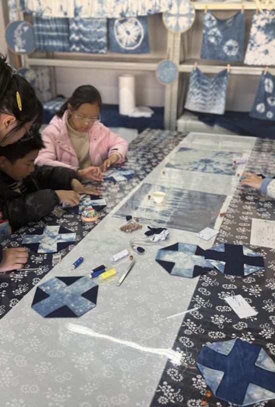 穿針、引線、縫合、裝繩……步驟雖不復雜,卻極其考驗孩子們的細心與耐心。小小的手指捏著細針,在柔軟的藍染布間穿梭。從最初的生疏,到逐漸熟練,一個個柿子形狀的輪廓在孩子們的手中慢慢顯現。那圓潤可愛的造型,搭配上古樸典雅的藍染色澤,仿佛一個個飽含深意的“藝術果實”。活動現場,時而安靜得只能聽見針線穿過布料的細微聲響,時而又爆發出完成關鍵步驟后的欣喜歡呼。
