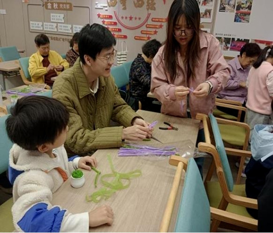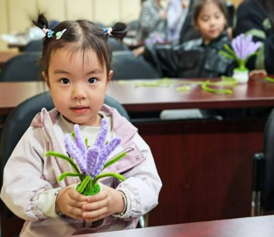 在扭扭棒創意手工課程,指導老師向大家展示了用扭扭棒制成的“多肉”“仙人掌”“玫瑰”等各式盆栽樣品。一件件精美別致的手工作品瞬間點燃了現場大小朋友們的創作熱情。在老師耐心講解了扭扭棒的彎折、纏繞、組合等基本技巧后,大家便迫不及待地動手實踐。一雙雙小手認真地將扭扭棒扭成枝葉,大人們則從旁協助,共同制作創意盆栽。現場不乏爺爺奶奶帶著孫輩共同參與的溫馨畫面,祖孫三代的歡聲笑語為活動增添了別樣溫情。