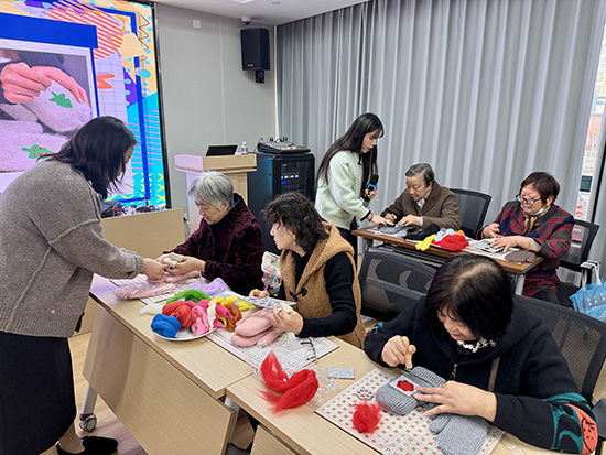 “阿姨們,要先抓出大概的羊毛量,再慢慢將羊毛用戳針戳刺出第一個造型,別一下子拿出太多,之后可以再拿一些羊毛繼續(xù)塑形,但大家要注意安全,帶上保護(hù)手指套,不要扎到手哦!”工作人員一邊巡視指導(dǎo),一邊反復(fù)叮囑安全事項(xiàng),耐心解答老人們遇到的問題。