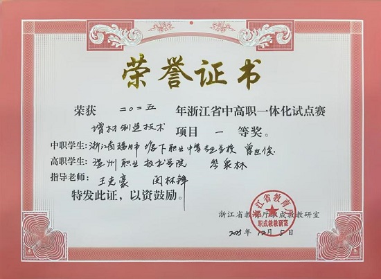 2025年12月5日,由浙江省教育廳主辦的2025年浙江省中高職一體化試點(diǎn)賽增材制造技術(shù)項(xiàng)目在諸暨市實(shí)驗(yàn)職業(yè)技術(shù)學(xué)校順利閉幕。最終,瑞安市塘下職業(yè)中等專業(yè)學(xué)校數(shù)控專業(yè)學(xué)生曾世俊(指導(dǎo)師:王克豪)與溫州職業(yè)技術(shù)學(xué)院瑞安學(xué)院學(xué)生岑泉林(指導(dǎo)師:閔林鋒)組成的團(tuán)隊(duì),憑借扎實(shí)的專業(yè)功底和出色的實(shí)踐能力榮獲浙江省一等獎(jiǎng)。這一亮眼成績(jī)的取得,是瑞安市和溫州職業(yè)技術(shù)學(xué)院長(zhǎng)期深入合作的結(jié)晶,更是瑞安市塘下職業(yè)中等專業(yè)學(xué)校作為溫州職業(yè)技術(shù)學(xué)院附屬學(xué)校區(qū)域中高一體改革實(shí)踐的生動(dòng)寫照。
