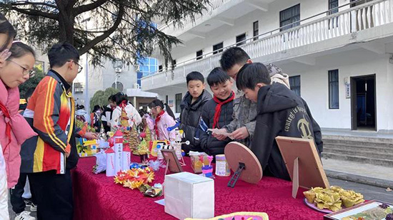 11月25日下午,諸暨市楓橋鎮洪綬小學廣場熱鬧非凡、人頭攢動。廣場四周或擺放、或懸掛著一系列充滿巧思的創意作品——落葉手工與環保手工作品琳瑯滿目,定格了秋日意趣。同學們駐足觀賞,時而對著心儀作品輕聲交流,時而在自己的作品前展露欣喜笑容,現場洋溢著濃厚的文化與實踐氛圍。