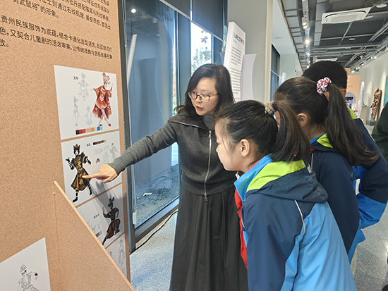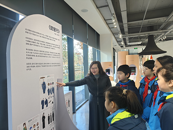 在上城區(qū)文化特派員張西琴的介紹下,孩子們的好奇心被徹底點(diǎn)燃。在《老鼠嫁女》展區(qū),大家圍著手稿追問(wèn)苗族刺繡的寓意;看到《琵琶行》的服飾配色變化,有同學(xué)主動(dòng)分享自己對(duì)詩(shī)句的理解。張西琴為孩子們搭建起通往專業(yè)藝術(shù)領(lǐng)域的橋梁,她結(jié)合展品細(xì)致拆解設(shè)計(jì)背后的文化內(nèi)涵與創(chuàng)作邏輯,讓孩子們讀懂蒙古族圖騰、唐代服飾形制如何與劇情深度融合,明白AI技術(shù)如何為傳統(tǒng)紋樣數(shù)字再生賦能。