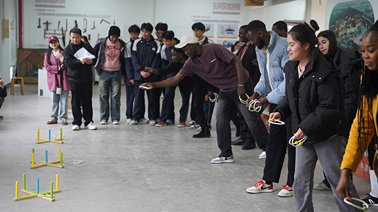 參觀結束后,木玩游戲挑戰點燃全場熱情。在學校專業教師、學生助理裁判的組織下,技巧球、投壺、魯班鎖、漢諾塔等兼具技巧與腦力的項目有序開展。中外師生分組競技、默契配合,在賽前練習與正式比拼中切磋交流,賽場之上歡聲笑語不斷。木玩專業學生的專業引導、英語組教師的順暢溝通,讓這場跨文化互動更顯順暢與暖心。