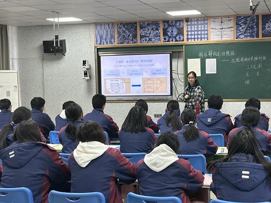 隨后,第二節(jié)公開課《幾何“透視鏡”:用三視圖解鎖素描結(jié)構(gòu)密碼》帶來了另一番教學(xué)精彩。課程打破了數(shù)學(xué)與美術(shù)學(xué)科的傳統(tǒng)界限,以三視圖為橋梁,將抽象的數(shù)學(xué)邏輯與具象的素描實操有機結(jié)合,成功解決了幾何體素描中“底面不等邊、頂點偏移、側(cè)棱不對稱”等常見難題。