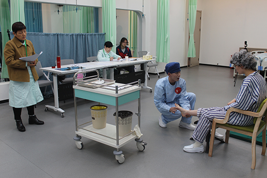 第二賽道里,選手們快速判斷老年患者傷勢(shì),包扎繃帶松緊適度,輪椅運(yùn)送時(shí)細(xì)心調(diào)坐姿、系安全帶,輕聲安慰讓“患者”倍感安心。